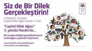 Capitol AVM – 2009 yılında başlattılan Capitol Dilek Ağacı projesi’nin 3. yılında Mardin’e gidiyor. Mardin – Kızıltep’de 1500 çocuğa mutluluk köprüsü kuran Capitol Dilek Ağacı 2009 yılında Van’da 450, 2010 yılında ise Artvin’de 1050 çocuğun hayallerini gerçeğe dönüştürdü. Mardin – Kızıltepe’de 1500 çocuktan toplanan dilekler 04 Temmuz – 15 Eylül tarihleri arasında kurulacak olan Capitol Dilek Ağacı; dilek gerçekleştirmek isteyen ziyaretçilerini bekliyor olacak.