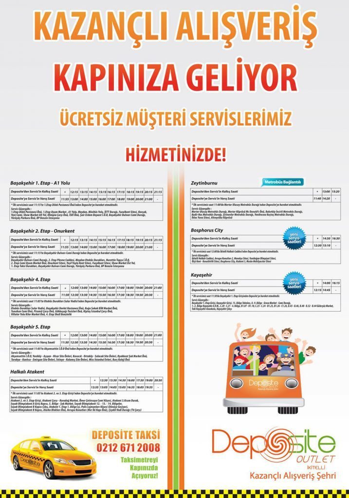 Deposite Alışveriş Merkezinden Başakşehir 1,2,4 ve 5. etaplara, Halkalı Atakent, Zeytinburnu, Bosphorus City ve Kayaşehir bölgelerine ücretsiz servis bulunmaktadır.
