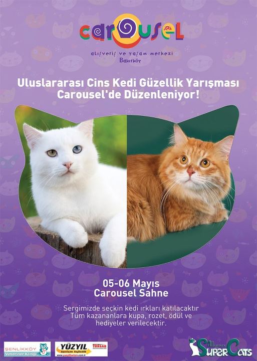 Carousel Alışveriş ve Yaşam Merkezi 05-06 Mayıs Tarihleri arasında Uluslar arası Cins Kedi Sevenler Derneği işbirliğinde Kedi güzellik yarışmasını düzenliyor. Veterinerlerden oluşan jüri ile belirlenecek olan cins kediler ırk kategorilerine göre, kas yapısı, yüz –burun ve tüyleri doğrultusunda değerlendirilerek derecelendirilecek.