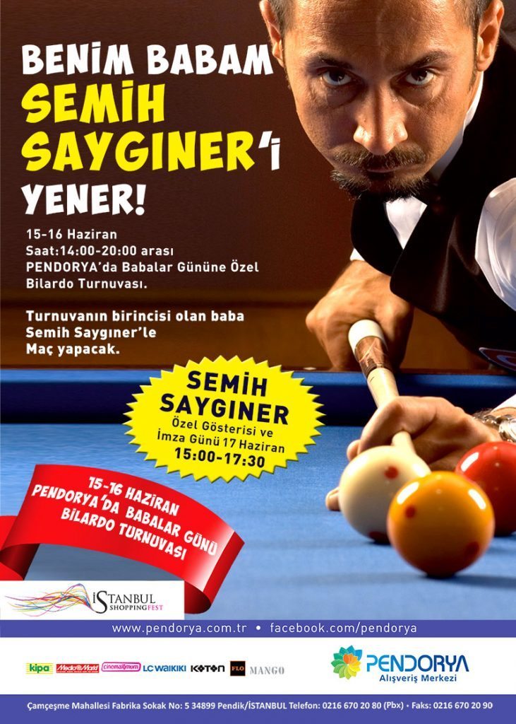 15-16 Haziran Saat: 14:00 – 20:00 arası PENDORYA’da Babalar Gününe özel Bilardo Turnuvası. Turnuvanın birincisi olan baba Semih Saygıner’le maç yapacak.