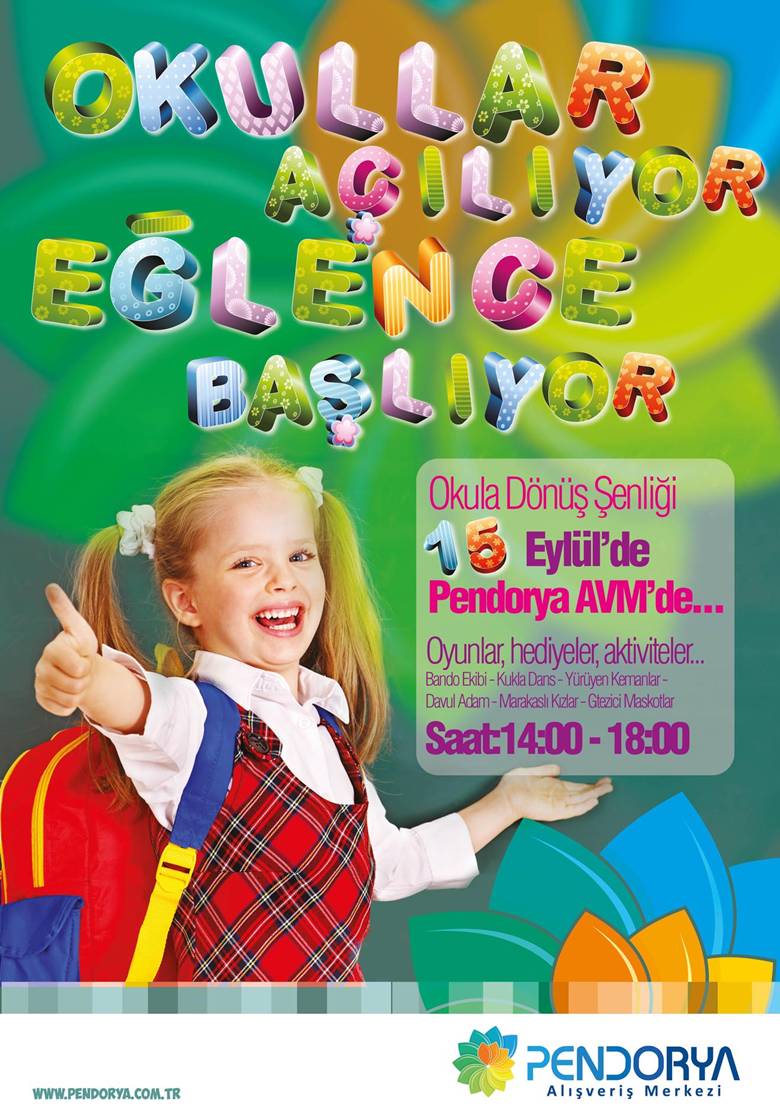 Pendorya Avm’ de OKULA DÖNÜŞ ŞENLİĞİ başladı Oyunlar,hediyeler, aktiviteler… Bando Ekibi -Kukla Dans – Yürüyen Kemanlar – Davul Adam -Marakaslı Kızlar – Gtezici Maskotlar Saat:14:00 -18:00