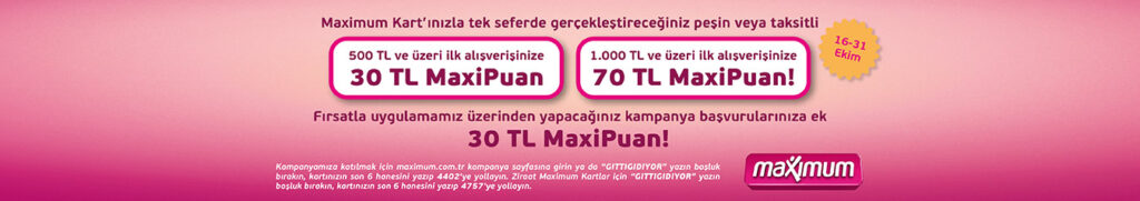 - 16-31 Ekim 2016 tarihleri arasında GittiGidiyor’dan tek seferde gerçekleştireceğiniz peşin veya taksitli 500 TL ve üzeri ilk alışverişinize 30 TL, 1000 TL ve üzeri ilk alışverişlerinize 70 TL MaxiPuan kazanabilirsiniz. FIRSATLA uygulaması üzerinden kampanyaya katıldığınızda ise ek 30 TL MaxiPuan kazanabilirsiniz.