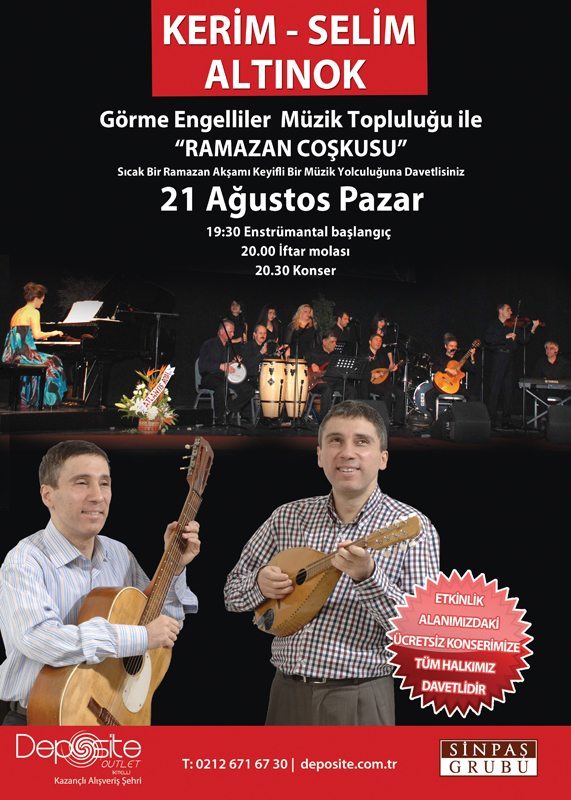 Ramazan ayı boyunca birçok etkinlik, söyleşi ve imza günü düzünleyen Deposite Outlet Merkezi, Deposite Rüzgarlı Sokağı’nda bu kez “Selim-Kerim Altınok” kardeşleri ağırlayacak. 2008 yılında kurulan topluluk akustik sazların ağırlıkta bulunduğu bir enstrüman grubu ve solistlerden oluşuyor. Türk Müziği’nden Batı müziğine, nostaljik melodilerden çigana, calzdan fasıl müziğine, türkülerden farklı ülkelerin halk şarkılarına uzanan geniş yelpazede, nitelikli bir çizgide sanatlarını icra ediyorlar.