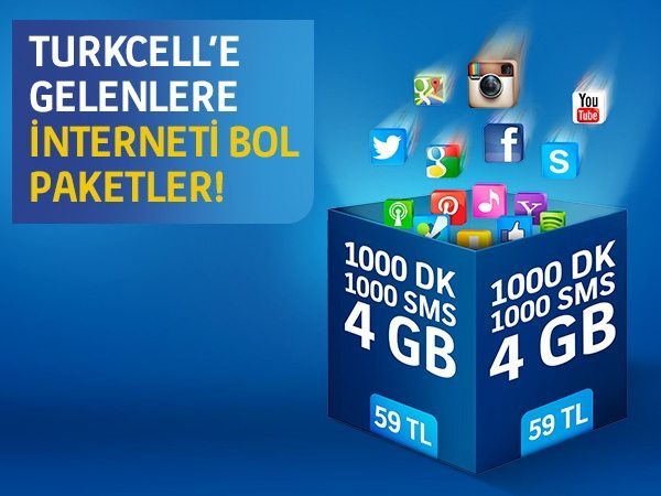 Turkcell’e yeni gelen, hattını taşıyan ya da faturasızdan faturalı dünyaya geçenlere özel 12 ay boyunca İnterneti Bol 500dk 4GB 1000SMS Paketi sadece 49TL, İnterneti Bol 1000dk 4GB 1000SMS Paketi sadece 59 TL!